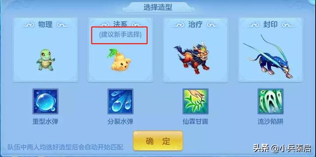 “水球大战”是一个2V2的玩法,玩家需要和另一名玩家组队来实现对抗,而对抗的方式就“扔水球”。进入该活动之前大家需要选择造型,金钱龟代表物理、小葫芦代表法系、瑞兽代表治疗、龙须豹代表封印。这里小编建议大家和我一样选择代表了法系的小葫芦,为什么呢?因为上面写着呢:“建议新手选择”!不过,一般不要和队友选择一样的角色,如果队友选择了小葫芦,你可以其他职业进行搭配,比如龙须豹就是一个不错的选择。
