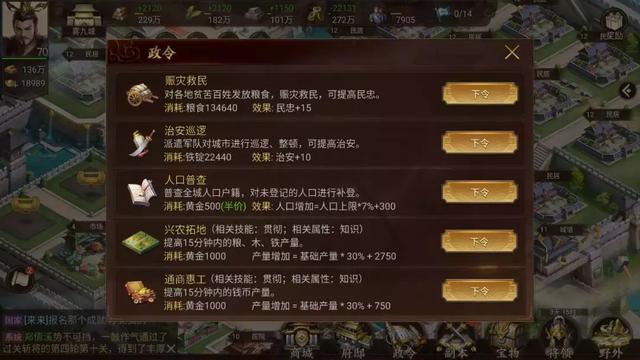 此外,在内政层面还有一些巧妙的设置,例如人口数量与民忠直接挂钩、民忠受治安和税率影响、税率直接关系城池的钱币收入、而钱币收入的基础产量又由人口决定,另外,征兵也消耗人口。在此基础上,玩家还可以通过发布政令、任命官员等操作对城池的各项属性进行调控或增益,在充分保障玩家自由执政的基础上也尽可能的模拟了一个真实的城市管理环境,十分考验玩家的大局观。