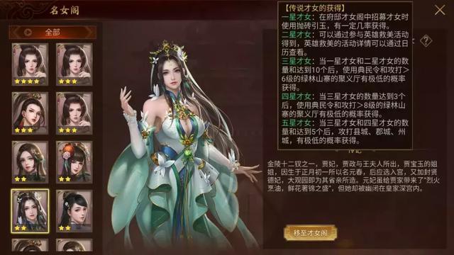 才女划分为1-5星,一星、二星才女可通过简单的招募以及“英雄救美”活动得到,越高星级的才女获取难度越大,4-5星仅能通过捕捉获取,不能通过招募,但前置条件并不复杂。