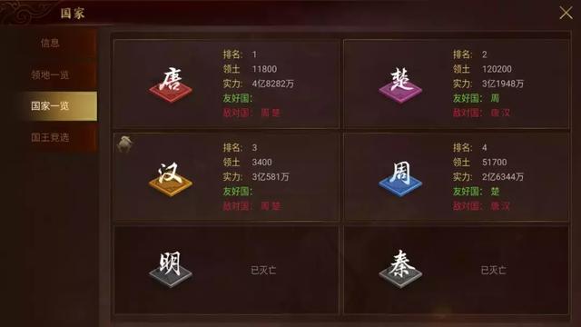 《梦想帝王手游》中共分为周、秦、楚、汉、唐、明六国,国家首都一旦被攻破,则国家灭亡;攻打首都需要国王对敌对国家发起灭国战,而发起灭国站需要发起国拥有目标国(敌国)5倍及以上的领土数量。