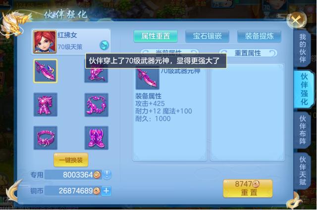 最后要说的就是伙伴装备的强化了,在伙伴强化中,玩家通过专用铜币可以重置伙伴的属性,从而选择更适合伙伴的装备,玩家通关每日的英雄试炼后就可获得专用铜币,可以将专用铜币进行积攒,从而重置出更加强力的伙伴装备。并且装备还可以进行宝石镶嵌来提升,并且可以将强力的装备进行装备提炼来为伙伴使用。