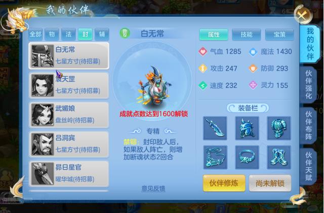 法系输出的摩昂太子在使用法术攻击敌人时,有一定几率使敌人进入重伤状态,辅助系的善财龙女不但在对局中能为队友恢复气血值,还能在自身阵亡时让一个已阵亡的同伴复活,有着绝地翻盘,反败为胜的重要作用。在封系伙伴中,白无常能够在封印敌人被击败后,为其附加两个回合的断魂状态,配合着削减抗性的效果,对于竞技场这种快节奏的对局来说,相当于让敌方减员,是很多玩家封系伙伴的首选。不过,白无常是成就解锁的伙伴,各位小伙伴在日常中记得多完成成就,这样才能早点解锁。