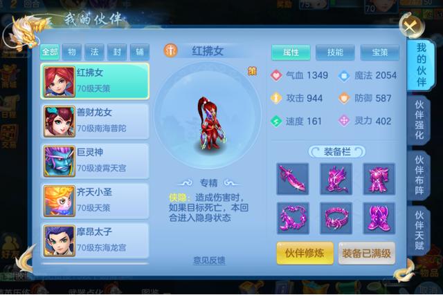 玩家在伙伴界面能看到都有不同门派的伙伴分类,其中分为物理输出型伙伴、法系输出型伙伴、封系伙伴、辅助伙伴来供玩家选择。新手玩家在任务达到一定条件后就会一一获得自己的强力伙伴,因为伙伴们来自不同的门派,所以伙伴在技能方面最好契合角色的需求。在前期,游戏赠予的物理输出伙伴红拂女、巨灵神不但能对敌人造成高额伤害,并且红拂女在击败对手后本回合还能进入隐身状态,而巨灵神气血越低,造成的伤害就越高。