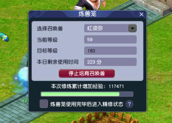 现在已经升到59级了,挂了近5个小时的成果。炼兽笼每天只能挂4个小时,获得的经验,我查了查,大致跟暗雷场景三倍满经验的相当。也就是说炼兽笼的速度跟挂暗雷练级的速度是一致的,区别是炼兽笼不需要战斗,没有装备耐久宝宝寿命的消耗。但同时少了暗雷战斗掉落环装、抓变异的收入,根据自己的需求吧,炼兽笼就是图个方便。