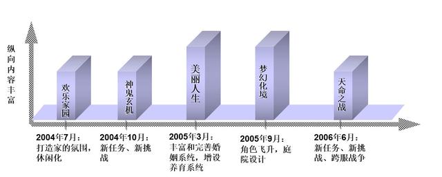 梦幻的5个资料片,从更新的节奏看,基本是每3个月1次,更新的内容主要是围绕扩展游戏丰富性进行,侧重为玩家营造一个丰富的虚拟社会