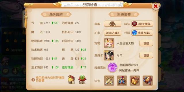 首先让我们先来瞧瞧这名玩家目前的属性面板,这名玩家是来自精锐组的月宫门派玩家,可以看到在经过打符变卡与两件器灵套装效果的加持后,物理伤害属性值已经达到了恐怖的1970点!同时角色其他属性也丝毫不弱,气血值4257点,物理防御1002点、法术防御943点,并且还有着832的速度值,整体属性均已经接近极限,非常令人羡慕。