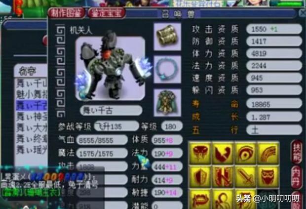 这只机关兽的外形是真的霸气,一身灰黑色的模样再加上庞大的身躯,给人一种仿佛比主人还要厉害的感觉,而真正强悍的地方可不是在他的外形上,这个机关兽一共11个全红技能,之后在资质上面,1,287的成长值,再加上攻击力高达1551点,不知道号主是花了多少钱才打造出这样一只召唤兽,可能真的就是因为机关兽的外形惹人喜欢吧!