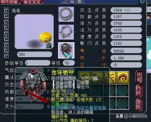表面上看来千年僵尸不仅携带等级高,而且技能栏并不多,但是我们来看看他携带的技能,防御、招架、土属性吸收都可以说是血宠能够用到的技能,而看起来碍眼的鬼魂,在炼妖时也能发挥相应的价值——我们知道,必带技能在合宠时会有更大概率会被保留,这就能帮助你获得技能栏更多的召唤兽。