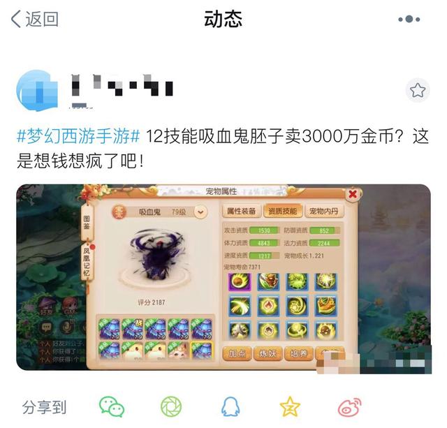 在梦幻西游手游中,12技能的宠物一直被大佬们所钟爱,可这并不意味着,12技能的宠物胚子随便挂都多少都能卖得出去。日前,说书人就遇到这样一位玩家,合出了一只12技能的吸血鬼,直接挂价3000万金币,引来不少玩家的围观。