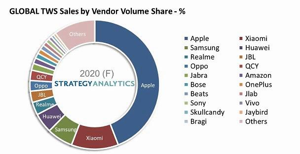 毫无疑问,真无线耳机给了手机厂商正面迎战传统耳机厂商一次绝佳机会。根据Strategy Analytics最近的报告中,2020年真无线耳机前几名的玩家都是手机厂商,苹果AirPods蓝牙耳机系列占据了超过40%的市场份额,紧随其后的则是小米,第三、四、五名分别是三星、华为、Realme 。