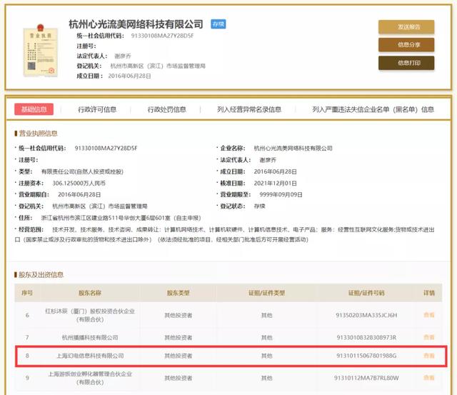 国家企业信用信息公示系统显示,心光流美成立于2016年6月,注册资本为306万,法定代表人为谢彦乔,上海幻电信息科技有限公司为其投资者,认缴出资额为15.3万元,占比约5%。