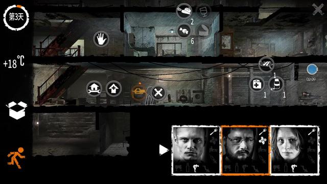 一开始,不同能力的人有不同的角色,你可以选择三个角色。他们偶然来到同一个废弃的老房子,组成了一个小“家庭”。那你就得操纵他们。晚上,你操纵一个人出去收集资源,抢劫,在黑市交易。其他人保卫基地睡觉;白天,修补房间的缝隙,利用各种资源制作道具、刀斧、枪支、雨水收集机、捕鼠器、烟草、取暖器、医药绷带等等。简而言之,尽一切可能确保你的几个人在战争结束前安全无恙。