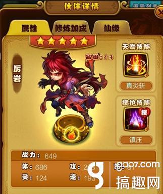 小编点评:话说厉岩技能有点牛啊,感觉这是第3回合之后要开始爆发的节奏,并且提升攻击效果会随着技能等级的增加而增加,后期打出的伤害简直不忍直视,真是杀敌就跟切菜似的,三刀一个有么有。