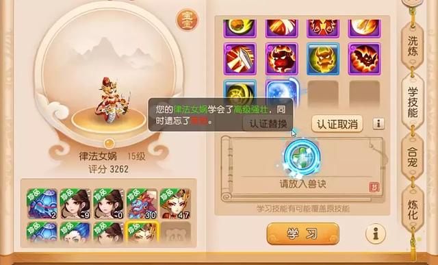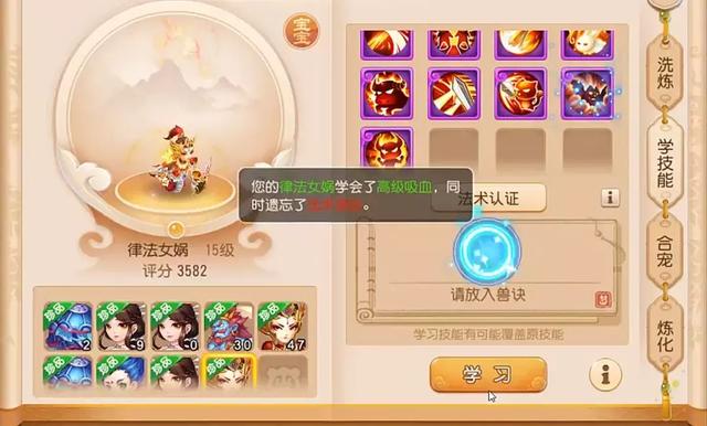 最后一本打高级偷袭,顶掉了7号位的高级吸血,补了一本高级吸血,直接顶掉了8号位的法术波动,成功全红!而且善恶这个技能还在!这样一只伤害爆炸的善恶律法女娲打成,在后面吃完资质丹和炼兽真经以后,一定会是一只非常强力的攻宠的!