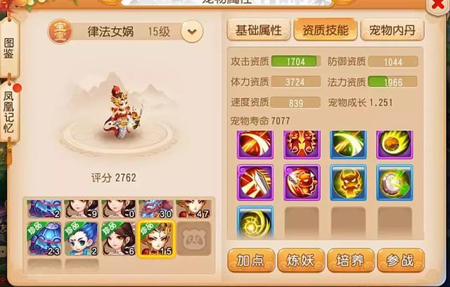 这次的号主要打书的宠物就是这只9技能的律法女娲,它拥有的技能善恶有报可以在大多数情况下给对手造成双倍伤害。资质方面这只律法女娲的攻击资质达到了非常爆炸的1704,这在律法女娲中是相当难得的资质了。成长1.251也还不错,而且还没有吃资质丹和炼兽真经。这位号主决定打成全红以后善恶还在的话再吃,也是一个比较不错的决定。