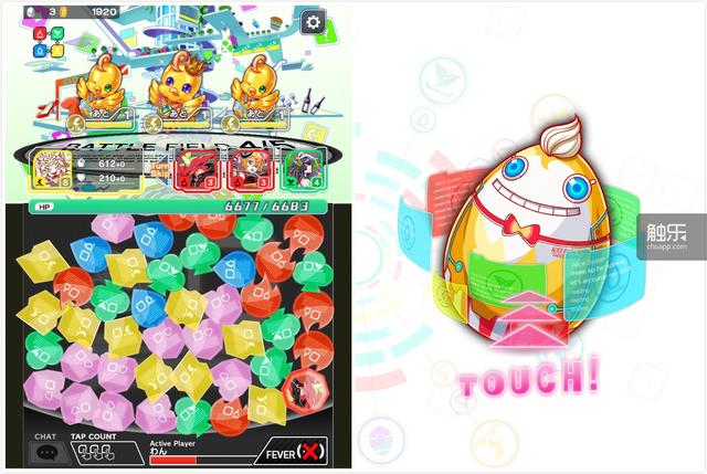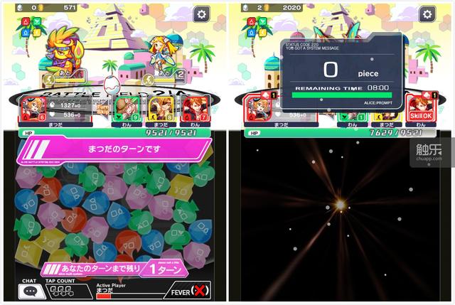 左边为等待另一个玩家操作,右边是Fever状态的画面。会有相同颜色的碎片团不断出现,玩家需要迅速点击以获取更多的攻击力