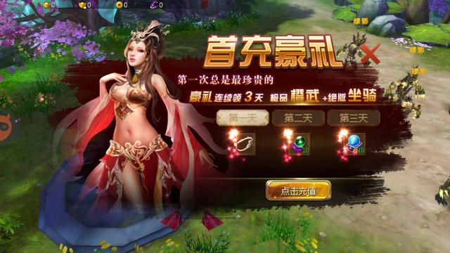 活动内容:首冲后三天内可领取橙武、专属坐骑、专属称号等实用奖励