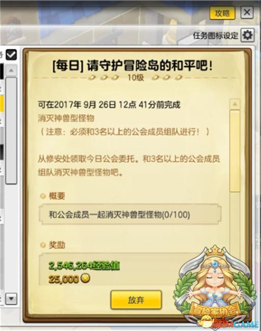 目前所知的每日任务有钓鱼、击杀怪物等,这些任务都需要和3名以上公会成员组队才能进行,所以该任务也旨在促进公会成员之间的感情喔!如果大家接到了击杀虫子的任务,建议前往丽迪斯水上乐园击杀虫子怪物,击杀野兽型怪物可以前往艾尔波森林,击杀不死型可以前往切利斯卡海湾,任何类型的怪物可以通过打开大地图搜索类型即可。