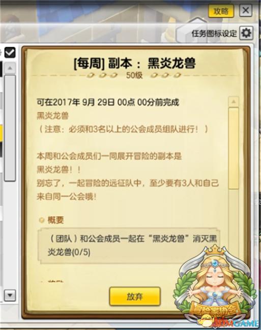 公会每周任务为击杀团队副本的BOSS,目前击杀单位只有黑炎龙兽,需要消灭五次才能完成该任务,奖励比每日任务丰厚,更加需要公会成员齐心协力击杀团队副本首领才能完成。