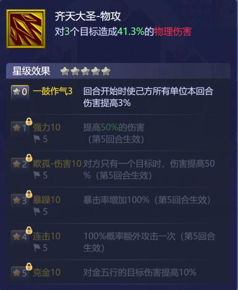 可以看到,齐天大圣的大招都在第五回合。第五回合生效的强力、欺孤、暴躁、连击会让齐天大圣的伤害瞬间爆炸。
