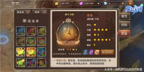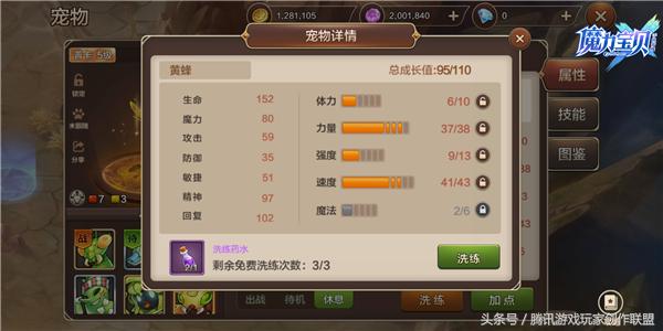 在洗练时大家要本着扬长补短的原则,选择宠物的优势属性优先提升。也就是说宠物本身擅长什么能力就提升什么能力,达到单一属性的极致增强效果。同时最好还要和宠物的加点同步,毕竟加点和洗练作为宠物的两大基础培养系统,相互之间一定要有配合。至于宠物的优势属性勇士们可以在宠物图鉴中方便的进行了解,如上图中箭头所指的位置就清楚的交代了宠物黄蜂所擅长的能力。