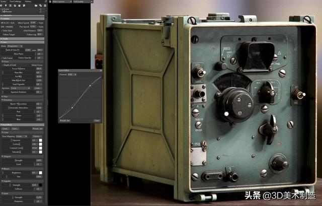 接下来配置摄像机,添加一个小的色差效果,焦点,颗粒,小插图,调整曲线并增加清晰度。