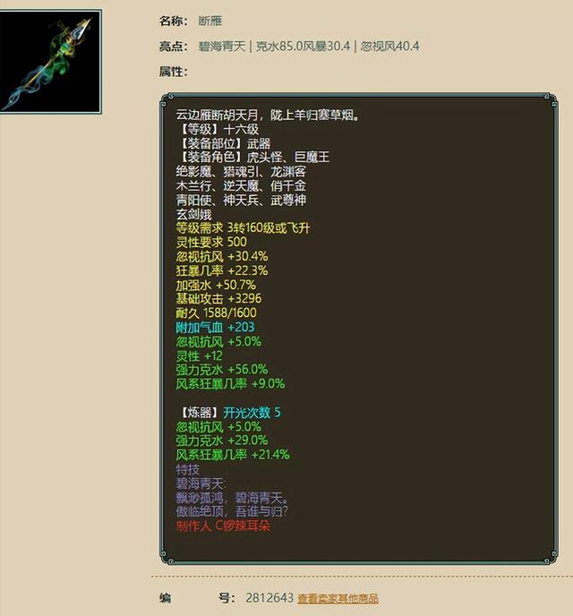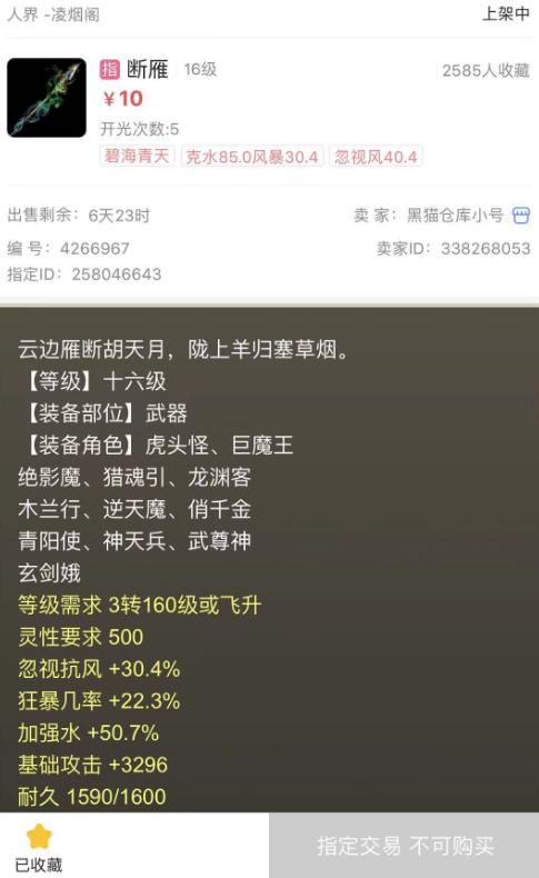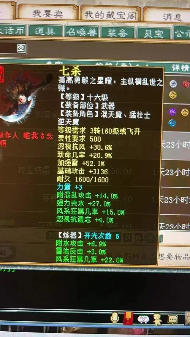 原来是被指定交易了,这是那把大将军神器16级风武器。克水85.风暴30忽视风40,秒杀6阶!虽然是线下交易了,但是应该也是在28w左右吧,肯定不会太低的!