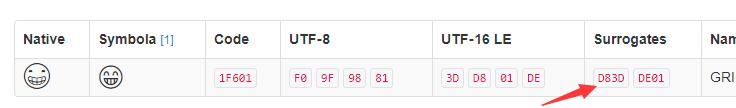 注意,有些表情是5位Unicode码,对于这种需要转成“前导代理”+“后尾代理”的形式(简单来说一个5位转成2个4位)。
