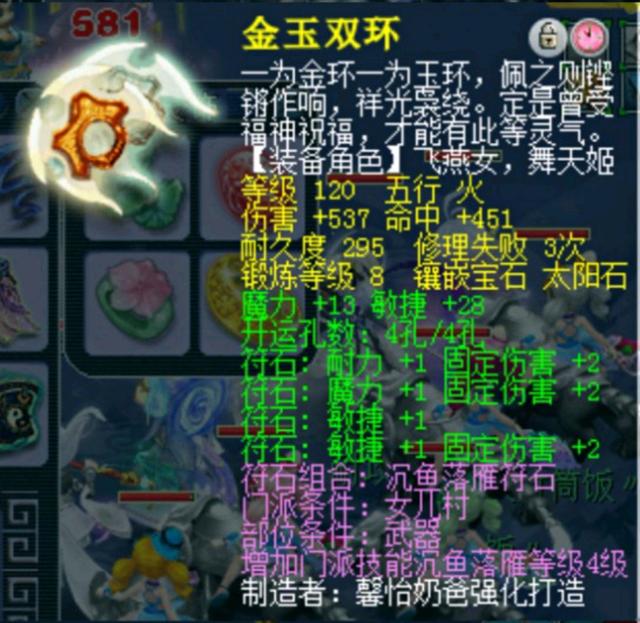 装备配置方面,武器大致属性如图所示,120级双环武器,无附加特技特效,但附加了魔敏双加达到了41,打了8级红玛瑙,开满了4孔。