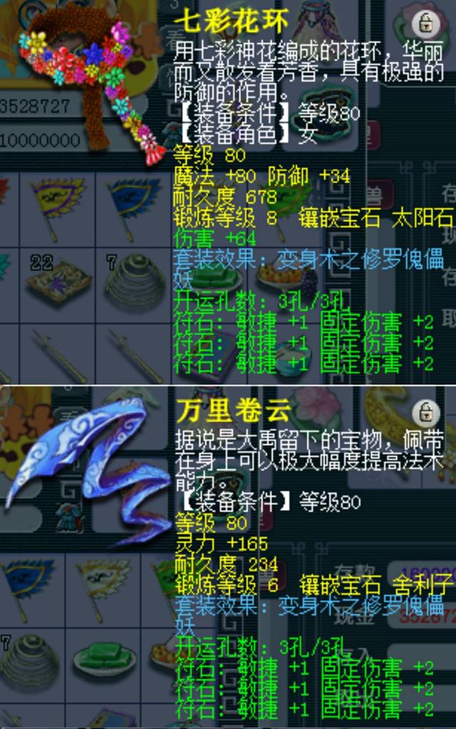 灵饰方面,配置了10件双固伤前排,非国标属性,4级锐步,5-6段,10件双法防一气血后排,5-6段星辉石。