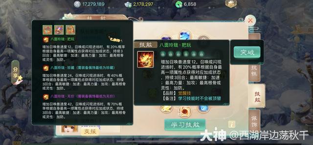 A6:可参考召唤兽开格子机制。觉醒技一共有六个格子,每开一个格子可以提升一定技能效果。突破材料为玄元丹,需要注意的是珍稀、神兽和普通召唤兽所需材料数量不一样。可以选择拼脸开,也可以选择必定开。