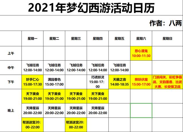 为了让大家更加直观的了解梦幻西游搬砖活动任务的时间,小编特意为大家做了一张图表,其中就是每种活动任务的活动时间以及优先级,其中标黄色底的是有空必做的活动任务,而红色字体黄色底的是优先级最高的活动任务。这样方便大家理解。