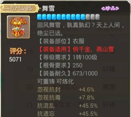 那么一件一阶仙器在10宝石的情况下能比高级装备多提供多少抗性呢,(30-24)*2*1.3=15.6,这样即使带上一阶仙器衣服帽子也只能提高31.2的抗性,也许有人说仙器还多了强法忽视,炼化值也会高些,但是即便算了这些谁的性价比更高呢?