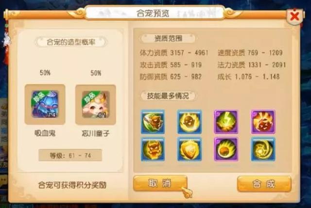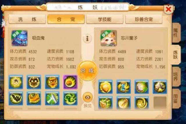 3、两只“胚子”的技能不要一样。这样合成出来的宠物技能才会更多,宝宝的能力也就更强。