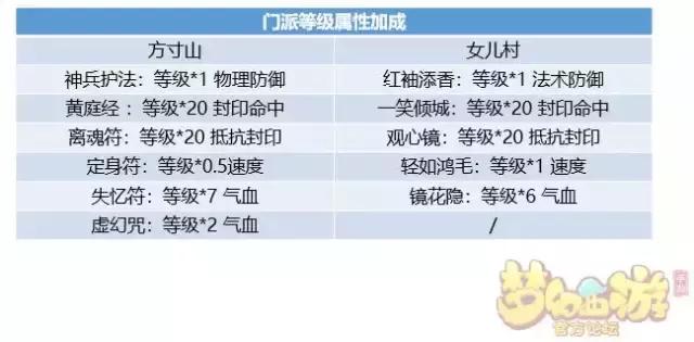 从属性加成可以看到,女儿村在经脉中拥有较多的速度加成。不仅如此,女儿村门派技能的速度加成也天生比方寸要高。如下图: