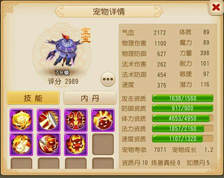 8技能律法!!!1.283近满成长,高防高吸血保证了一定的生存能力,反震虽然不如反击,但是对于特殊技能宝宝也不能要求太高~