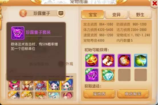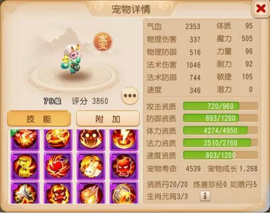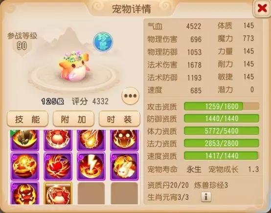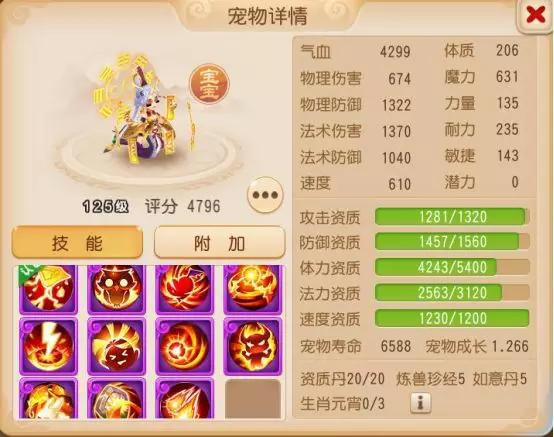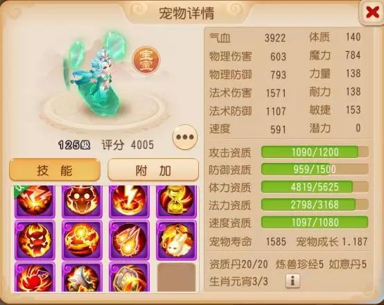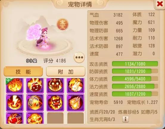 前面灵儿提过珍露童子的宠物装备拥有秒4的能力,所以不少小伙伴将珍露童子打造成群法宠,下面这只10技能珍露童子各项资质相当出众,技能搭配也十分合理。