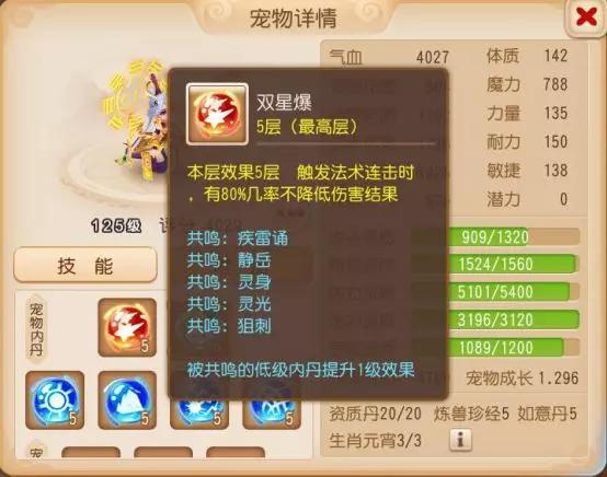 法宠的高级内丹选择比较多,双星爆、通灵法、催心浪、轮回破都是不错的选择,可以根据自己宠物的定位进行选择,低级内丹推荐静岳、灵光、灵身、狙刺。