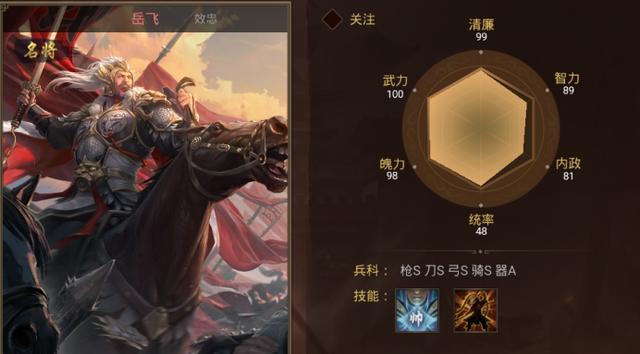 从属性图中我们不难看出,岳飞作为中华名族的英雄,一代战神,在战争端的属性可以说是完美的,武力满值,魄力统帅两项也是顶级,清廉更是不用说,历史上岳家军除了在战斗上面勇往直前,在军队作风上面得的盛誉:"冻死不拆屋,饿死不掳掠"也在游戏中得到了体现。同时,他对于兵种的加持也是极为出色,枪兵,刀兵,弓兵,骑兵这四个兵种都是S级别。尤其是骑兵,这也是体现历史上岳飞,他利用与金齐联军交战的机会,获得大量战马并组建了南宋历史上第一支真正意义上骑兵,岳飞也成为南宋历史上第一个能够大规模以骑兵发起集团野战的将领。