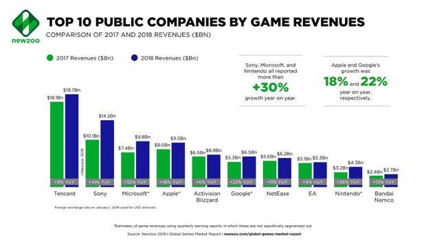 所以腾讯游戏到底有多赚钱?根据市场研究机构Newzoo今年四月份发布的2018年全球游戏市场报告,腾讯2018年的游戏营收达到了197亿美元(以当前汇率,约合人民币1391亿),占据了去年全球游戏市场近15%的份额。同时以腾讯手游《王者荣耀》为例,今年年初的移动应用分析平台Sensor Tower发布的数据显示,2018年《王者荣耀》在全球App Store和Google Play合计营收达19.3亿美元(约合136亿人民币),这一数据还不包括中国和其他地区的第三方Android应用商店的收入,《王者荣耀》当之无愧的成为了去年吸金能力最强的手游。