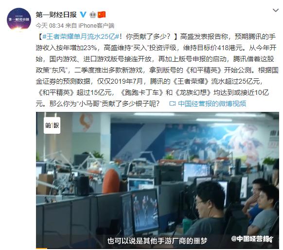 今日(8.12)据第一财经日报报道,随着今年国内游戏、进口游戏版号的接连开放,加上游戏版号的申报重新启动,腾讯在这个政策的加持下,二季度推出多款新手游,同时拿到版号的《绝地求生:刺激战场》公测版本《和平精英》也正式开启了公测。而根据国金证券的预测数据,在今年七月份,腾讯的《王者荣耀》月流水超过了25亿元人民币,《和平精英》过15亿元,而刚上架不久的《跑跑卡丁车》手游以及《龙族幻想》均达到或接近10亿元。