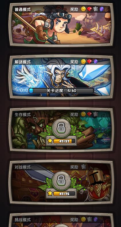 不知道是不是游戏开发团队规模小的原因,对长在游戏过程看到了不少其他游戏UI的影子:比如这个箱子和卡牌像皇室战争里的箱子,主界面的关卡图表类似皇家保卫战,甚至有关卡放着虎牙直播的图标!不知这是故意设计还是无意为之呢?