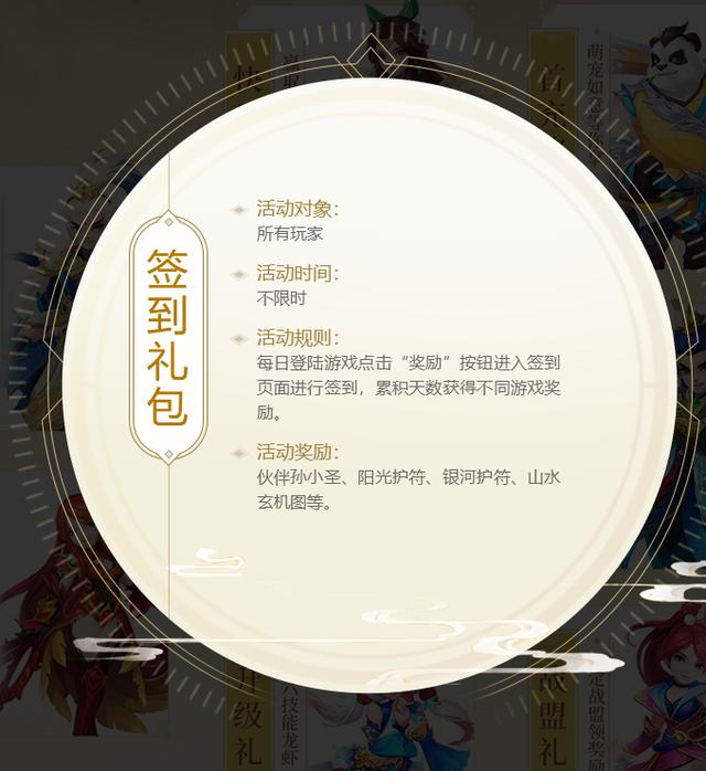 最基本的签到福利肯定是不可或缺的,所有的玩家都可以在游戏中完成每日签到,累计签到就有机会获得伙伴孙小圣、阳光护符、银河护符、山水玄机图等精美礼品哦。最关键的是这个活动是不限时的,以后我们每天都能参加了。