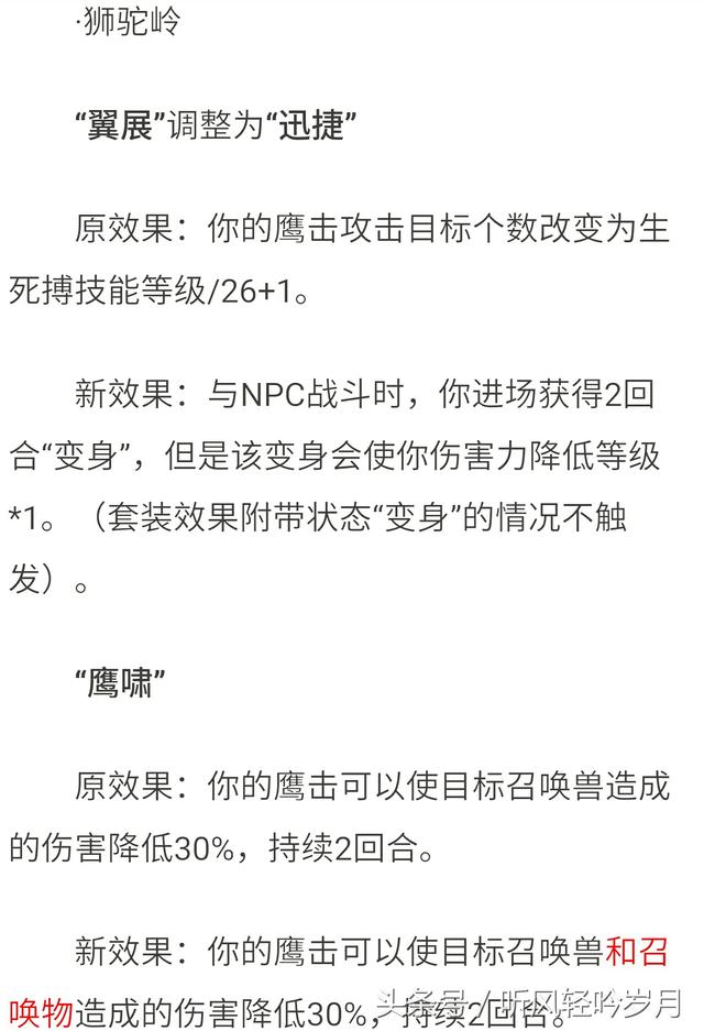 奇经八脉的调整,开场获得两回合变身,就是说,一回合鹰击,一回合休息,剩下的靠平A,感觉也太没有诚意了,不过这倒也是,本来狮驼就已经灭门了。高级变身套装的价格一跌再跌,低级变身价格近似环装价,狮驼岭再也不是那个傲娇的门派,依旧还是点卡杀手!
