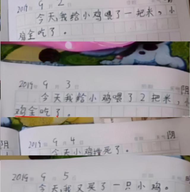 该日记主要有四天,记录了小学生养小鸡的过程,也可以说是小鸡“被害”的全过程。很多网友看完后,都表示这位小学生,能把日记写的让人脊背发凉,也算是个人才。