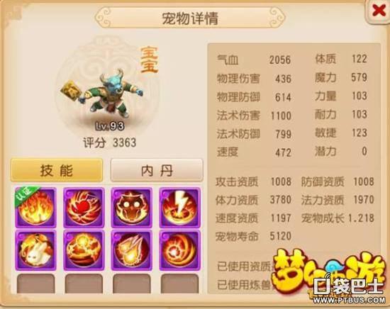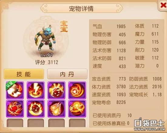这只牛头的防资体资法资都突破了上限,成长更是达到了携带等级为75级的宠物的水平,8个技能格子都已用红书填满,作为一只法宠已经很优秀了~看它那架势,难道不是在说:“看什么看?信不信我水漫金山你!”