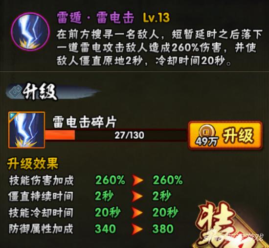 雷电击,这个秘卷自从改版被削弱以后,一直不温不火的,X轴和Y轴的缩减,以及CD的延长,对忍者的适用性大大降低。但是相对于比较依赖雷击的忍者还是依旧可以使用,譬如,角度。