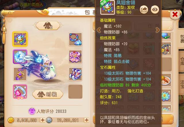 楼主率先展示的是自己角色的几件装备,首先晒出的是一件90级的简易发钗,不但基础属性不错,而且还有弱点击破特技,对物理系门派玩家来说实用性非常高。并且这件装备也打上了两颗13级太阳石,能够让角色的物理伤害能得到极大的提升。