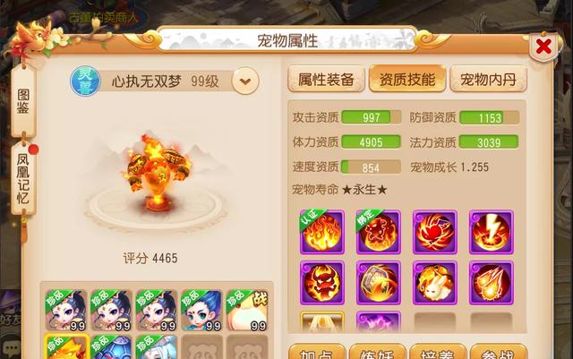 紧接着晒出的这只火灵兽也很不错,法力资质达到了3039,体力资质4905,防御资质1153,成长1.255,整体属性远超勇武组主流水平。而且技能搭配方面,兼顾到了生存与输出,在战斗中的表现即便是相比珍兽也不逞多让。