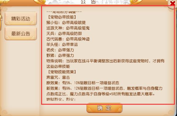在本次战斗平衡中对猴小仙、巡游天神、天兵、古代瑞兽、羊头怪、老虎与野猪宠物增加一个必带技能,帮助玩家在合宠时提高合出多技能宠物的概率。同时强化四系法术的攻击效果,其中雷系法术有一定概率能够驱散首目标的一项增益状态;火系法术有一定概率给首目标附加灼炎状态;水系法术有一定概率冰冻首目标;土系法术有一定概率眩晕首目标。经过此次调整后,玩家的法宠在战斗中将会发挥出更加强大的实力。